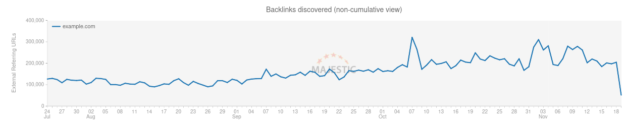 Chart note: Default daily view shows data points for any given day. Since our crawl rates increased considerably since 2006 it is advisable to either use normalized view and/or compare domains with each other in order to get more comparable data.